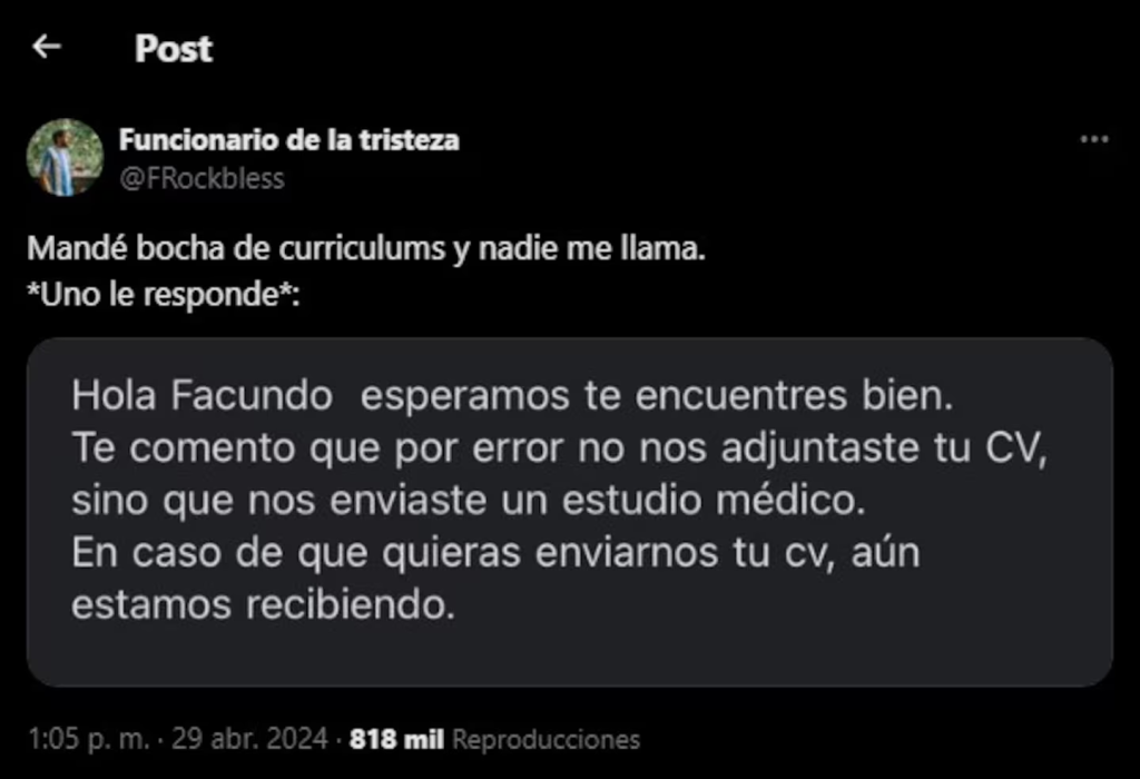 El joven, que se llama Facundo y se identifica en su cuenta de la red social Twitter (ahora X) como Funcionario de la Tristeza @FRockbless, buscaba trabajo. Y, como les ocurre a muchas personas, envió muchísimos currículum vitae, pero no obtenía ninguna respuesta. Hasta que le llegó el comentario salvador de un reclutador empático, que le reveló el error que había cometido y por el cual nadie lo llamaba.
