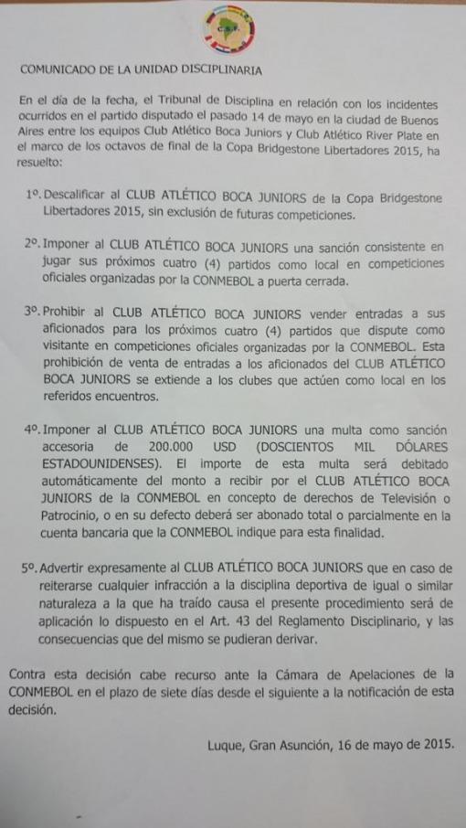 En tanto, Boca recibió una sanción mucho más leve de lo esperado, ya que en un principio se especuló con la suspensión de su cancha y además una exclusión por dos años de torneos internacionales.
