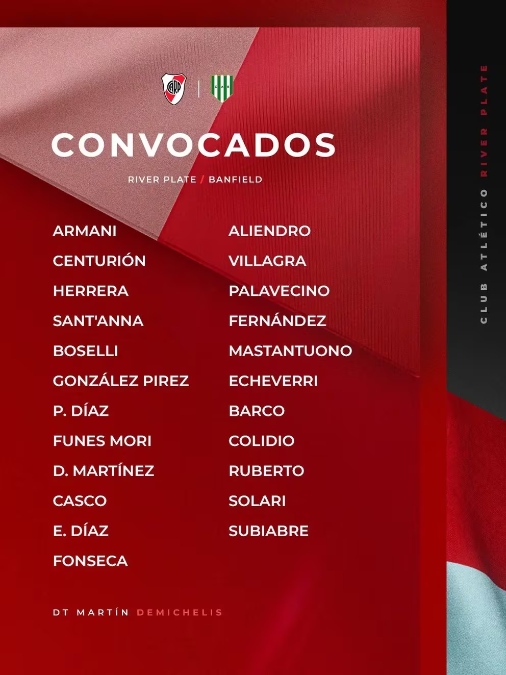 Martín Demichelis, director técnico de River Plate, ha dado a conocer la lista de jugadores convocados para el próximo partido contra Banfield, que se llevará a cabo en el estadio Monumental. El equipo de River Plate busca recuperar los puntos perdidos en su último encuentro y mantenerse en la cima del Grupo A de la Copa de la Liga.