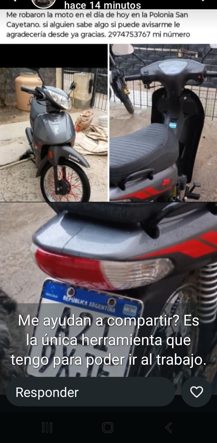La mujer también solicitó que, si alguien tiene información sobre el paradero de la moto, por favor se comunique con ella al número 2974 753767. Agradece de antemano cualquier colaboración que pueda recibir.