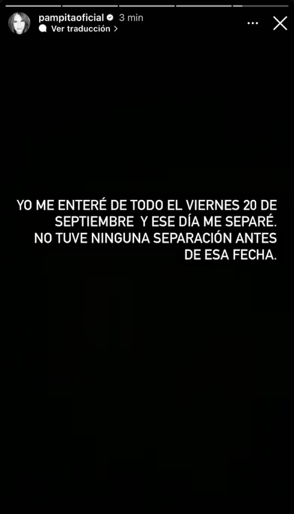 Aún así, Pampita desmintió la fecha de la separación que esbozó Moritán. Tras su declaración en Instagram, compartió una serie de chats con el ministro porteño que mostraban cómo su relación continuaba antes del 20 de septiembre. En las capturas, se veía que ambos eran muy afectuosos entre sí, con apodos románticos como “mi amor” y “amor mío”, principalmente de parte de él, que constantemente le recordaba que la extrañaba. En la última captura que compartió, se ve cómo le envió a Moritán una publicación de América TV que decía que ellos se habían separado. “Ellos dijeron estos días que estábamos separados. Que la relación estaba terminada”, escribió ella. “Igual los voy a poner a prueba. Gracias amor”, le contestó él.