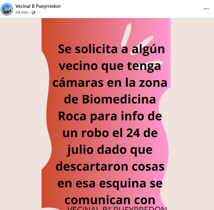 La Vecinal del Barrio Pueyrredón realizó un llamado a los vecinos que cuenten con cámaras de seguridad instaladas en la zona de Biomedicina Roca para colaborar con información relacionada a un robo ocurrido el pasado 24 de julio.