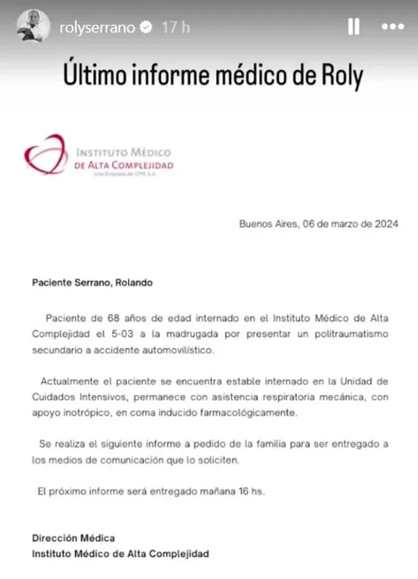 “Paciente Serrano, Rolando. Paciente de 68 años de edad, internado en el Instituto Médico de Alta Complejidad el 5.03 a la madrugada por presentar un politraumatismo secundario a accidente automovilístico”, detallan los médicos del IMAC, sanatorio ubicado en el barrio de Almagro.