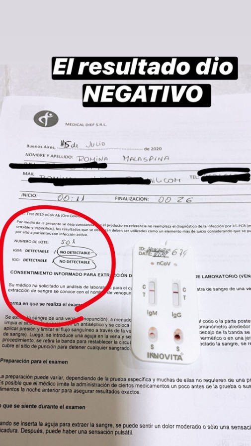 “Bien, para que se queden todos tranquilos, anoche 1 am vino el médico a casa a hacerme rápido el test”, informó luego Romina mostrando la hoja del análisis.