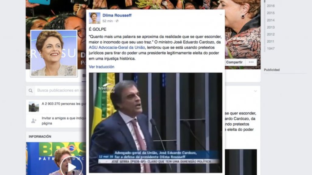 «Es un golpe. Cuanto más una palabra se acerca a la realidad que se quiere esconder, mayor es la incomodidad que su uso trae. El ministro José Eduardo Cardozo recordó que se están usando pretextos jurídicos para sacar del poder a una presidente legítimamente electa en una injusticia histórica», expresó Dilma Rousseff en su cuenta de Facebook.