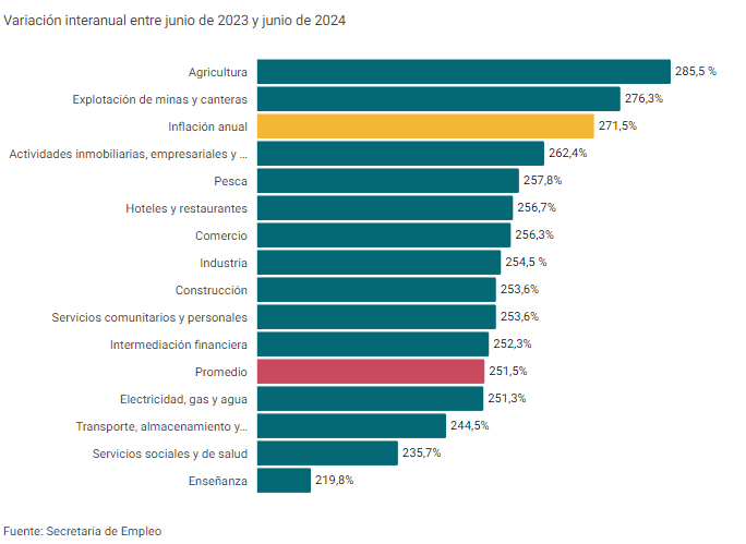 El último dato de salarios del SIPA corresponde a agosto, y la apertura por sectores tiene un poco más de rezago y alcanza hasta junio, que es el momento en que el Gobierno aseguró que comenzó la recuperación salarial. La información de la cartera laboral muestra que en promedio los salarios registrados de los 14 sectores estudiados -que son los mismos clasificadores que utiliza el Indec para sus mediciones- aumentó en términos nominales 251,5% anual en junio, mientras que el IPC de ese lapso fue de 271,5%, veinte puntos porcentuales mayor.
