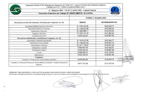 Para dar un indicio, la categoría más alta del personal de servicios automotor («Especialista múltiple superior de Servicios») tendrá un aumento del 4,66% contemplando el salario básico inicial $1.343.422 + incremento no remunerativo de $62.549. Las partes, que se volverán a reunir el 1° de abril para revisar la situación salarial de los convenios 27/88 (SMATA-FAATRA) y 499/23 (SMATA-ACARA).