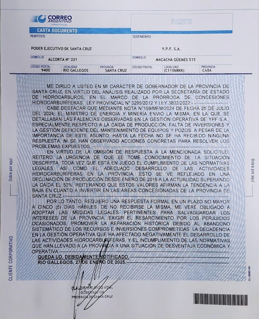 El Gobernador de Santa Cruz, Claudio Vidal, envió una carta documento a la petrolera en la que exige «inversiones, cumplimiento de normativas y una gestión eficiente para revertir la caída productiva en las áreas concesionadas». El proceso de salida de YPF de Santa Cruz ya lleva la firma de más de 400 acuerdos de retiros voluntarios entre la empresa y sus empleados.