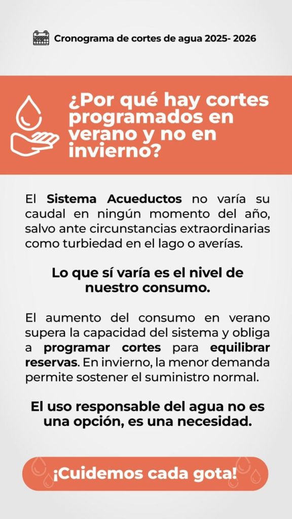Durante el verano, el uso intensivo del recurso —vinculado a las altas temperaturas y al mayor consumo domiciliario— excede la capacidad del sistema, lo que hace necesario implementar interrupciones preventivas. En cambio, en invierno la menor demanda permite sostener el suministro sin restricciones.
