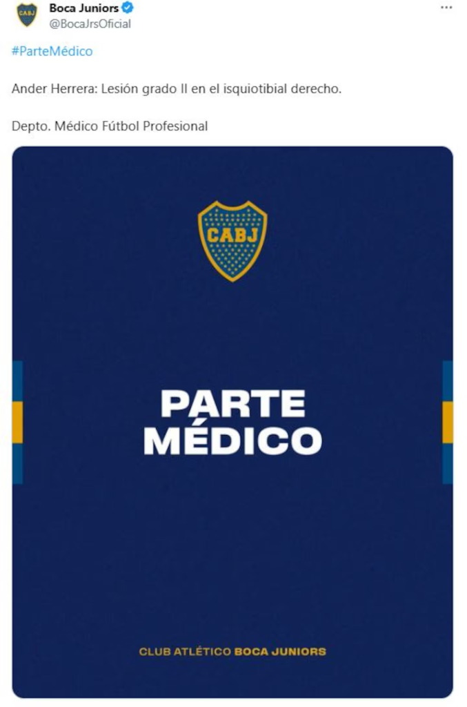 Boca confirmó la lesión de Ander Herrera. Se trata de un desgarro en el isquiotibial derecho. Los estudios médicos confirmaron el diagnóstico luego de la molestia que el español de 35 años había sufrido en el partido ante Argentinos Juniors en la Bombonera por la primera fecha del Torneo Apertura.