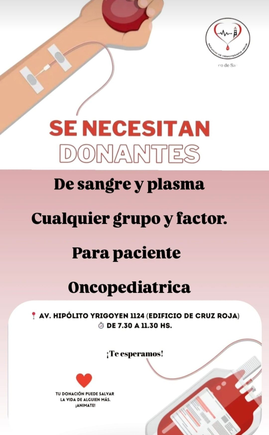 El Centro de Hematología lanzó un llamado urgente a la comunidad solicitando donantes de sangre y plasma para una paciente oncopediátrica.
