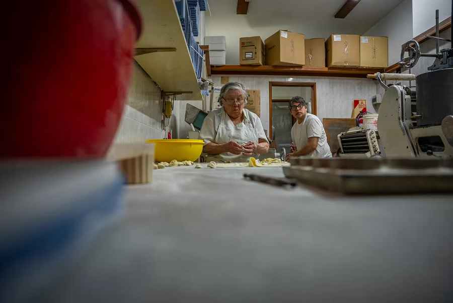 La rutina entre ambos comienza con un mate cocido y una primera charla en la que ella le dice que prefiere quedarse un rato más en la cama mientras él termina de cambiarse para caminar hacia la fábrica de pastas y comenzar la elaboración.