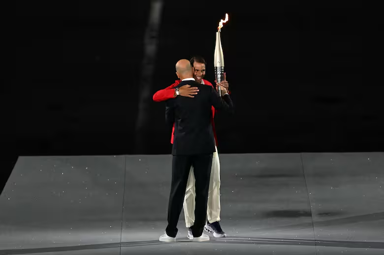 Surgió Zinedine Zidane, tomó la antorcha de mano del caballero enmascarado y se la cedió al tenista español Rafael Nadal, antes de que un show de luces y música gane protagonismo sobre la Torre Eiffel, que luego del colorido terminó quedando por unos segundos a oscuras. Sólo se podían observar los anillos en medio de la noche parisina. De pronto, Nadal apareció en una lancha con esa llama olímpica camino al pebetero, junto a Serena Williams, Nadia Comaneci y Carl Lewis, las leyendas que se unen a la fiesta.
