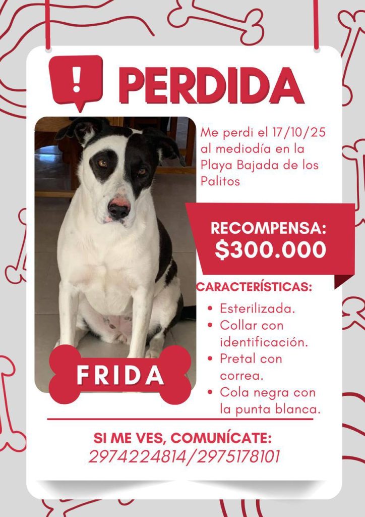 Una familia de Comodoro Rivadavia solicita ayuda de la comunidad para encontrar a su perra Frida, que se perdió el pasado 17 de octubre al mediodía en la zona de Playa Bajada de los Palitos.