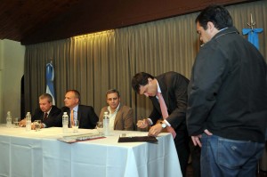 El gobernador Martín Buzzi encabezó hoy la firma del acta acuerdo para el reinicio de la obra de ampliación y refacción del Hospital Alvear y en el mismo acto rubricó también el acta compromiso para la construcción del muro de defensa costero, que incluye un camino alternativo en inmediaciones del nosocomio del barrio General Mosconi.