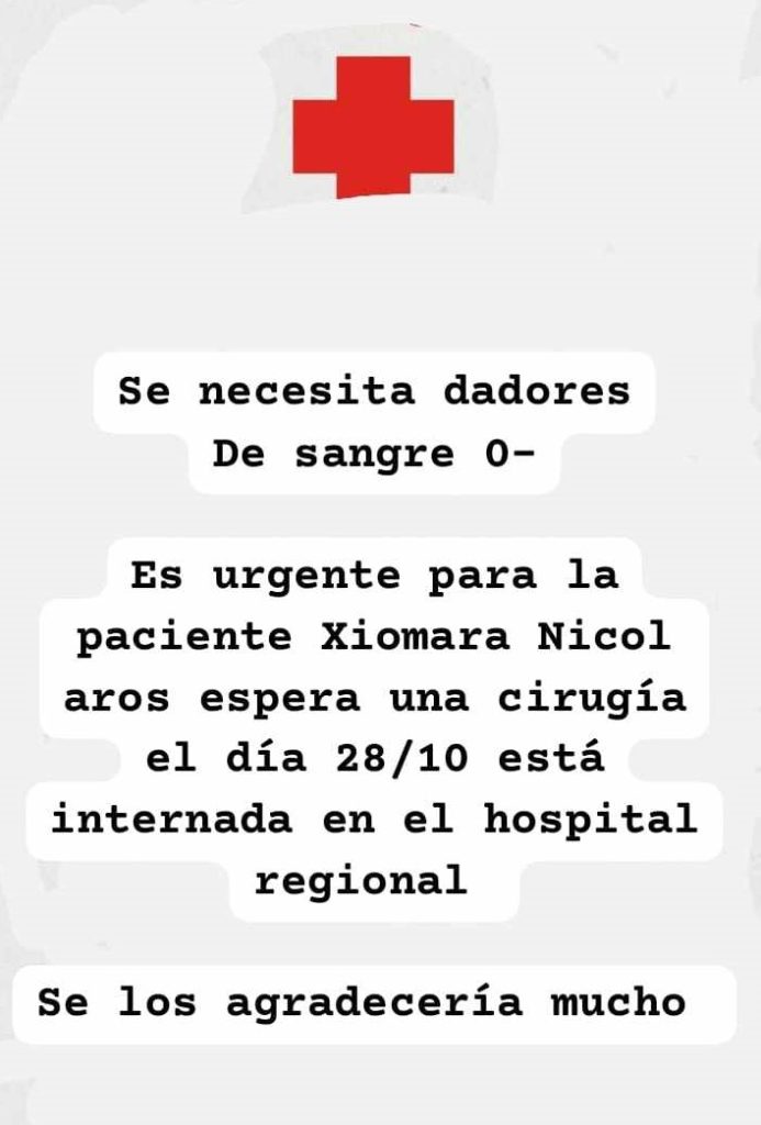 La familia de Xiomara pide con urgencia donantes de sangre grupo 0- para su tratamiento.