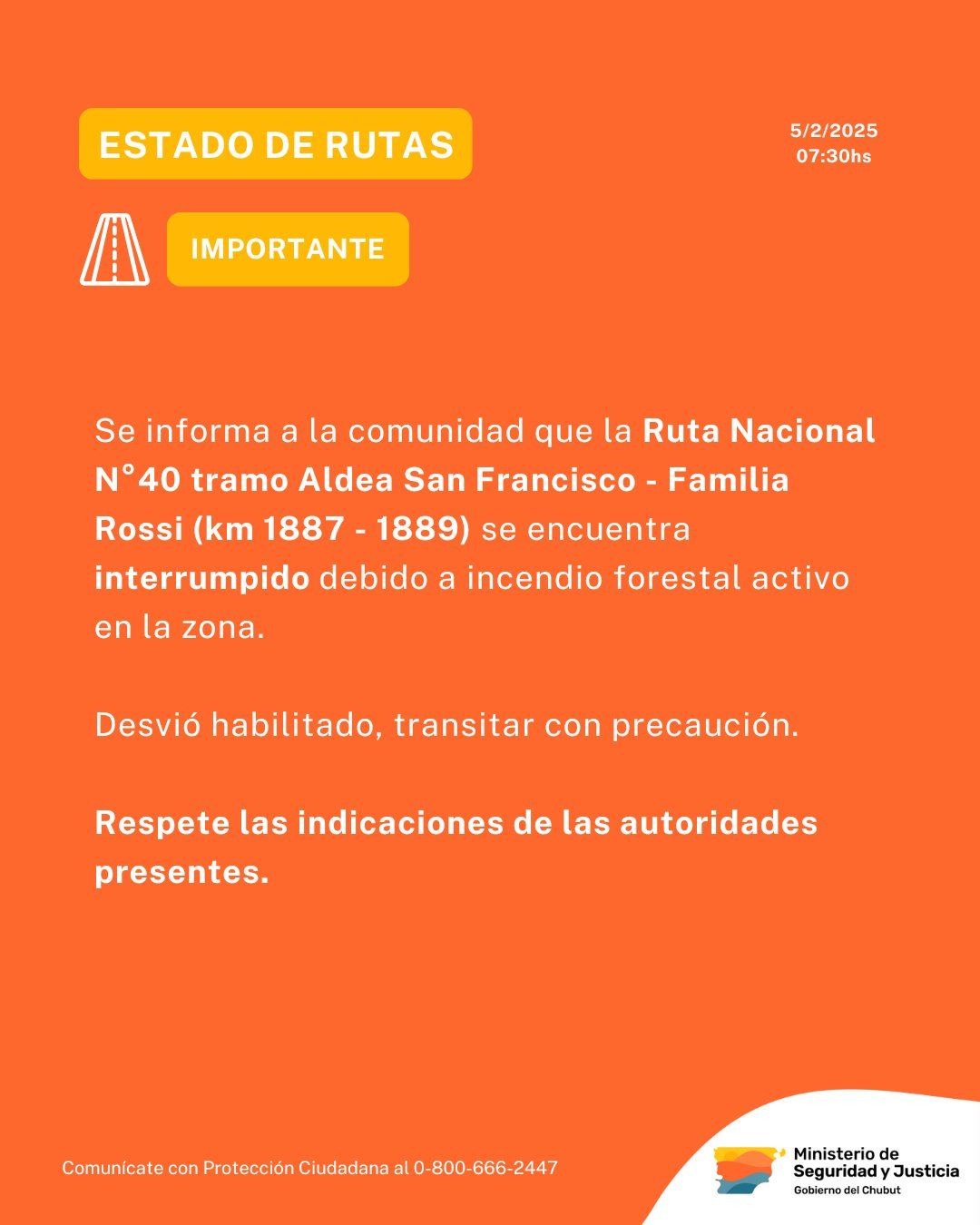 Desde la Subsecretaría de Protección Ciudadana, dependiente del Ministerio de Seguridad y Justicia de Chubut, informó que la Ruta Nacional N°40 está interrumpida en los kilómetros 1887 y 1889, en el tramo Aldea San Francisco – Familia Rossi, por un incendio forestal que comenzó esta madrugada del miércoles.