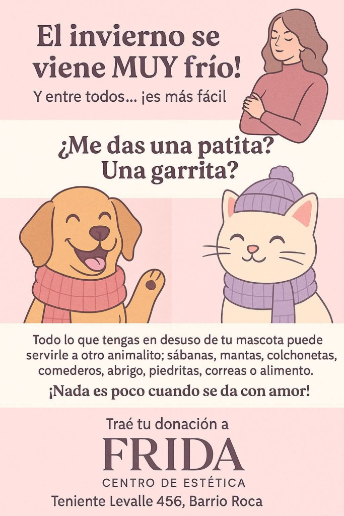 Las donaciones pueden entregarse en Frida Centro de Estética, ubicado en Teniente Lavalle 456 Barrio Roca, o bien coordinarse para su retiro vía WhatsApp en la zona Sur, facilitando así la participación de quienes deseen colaborar.