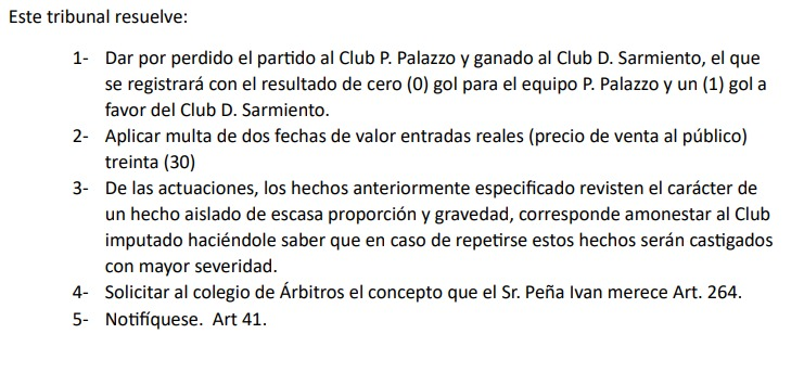 Tras varios días en los que intervino la Policía y Fiscalía en el episodio, finalmente el Tribunal de Disciplina definió darle por perdido el partido a Palazzo, otorgando los 3 puntos a Sarmiento con un resultado de 1 a 0.