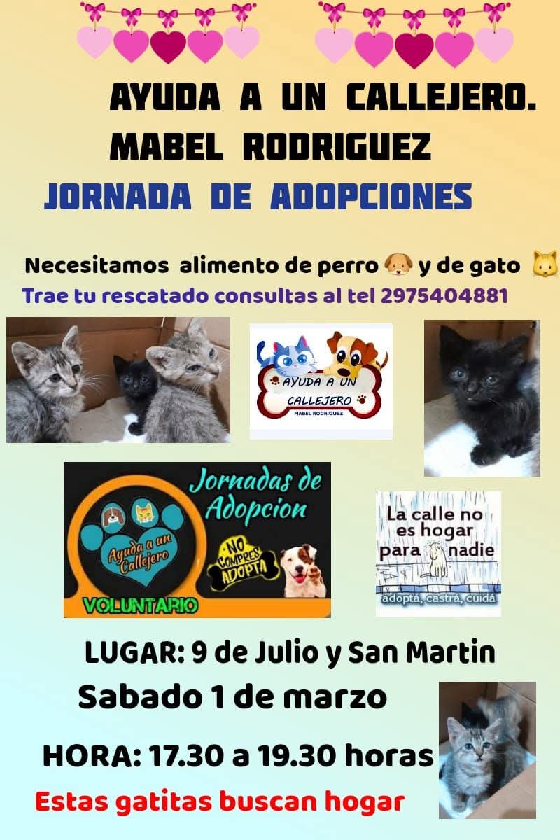 Este sábado, 1 de marzo, en la esquina de 9 de Julio y San Martín, Mabel Rodríguez organiza una nueva jornada de adopción de mascotas. Si estás cerca, podes pasar por allí para conocer a los animales que buscan un hogar.