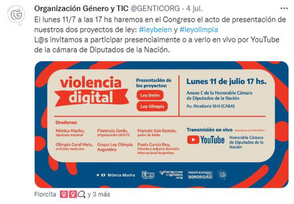 Esta iniciativa tomó forma concreta de la mano de la organización Género y TIC (GENTIC), y el grupo Ley Olímpia Argentina, que sumó apoyo desde las filas del Congreso, con la diputada del Frente de Todos Mónica Macha. Se materializó en dos proyectos: el de “Ley Olimpia” y “Ley Belén”.