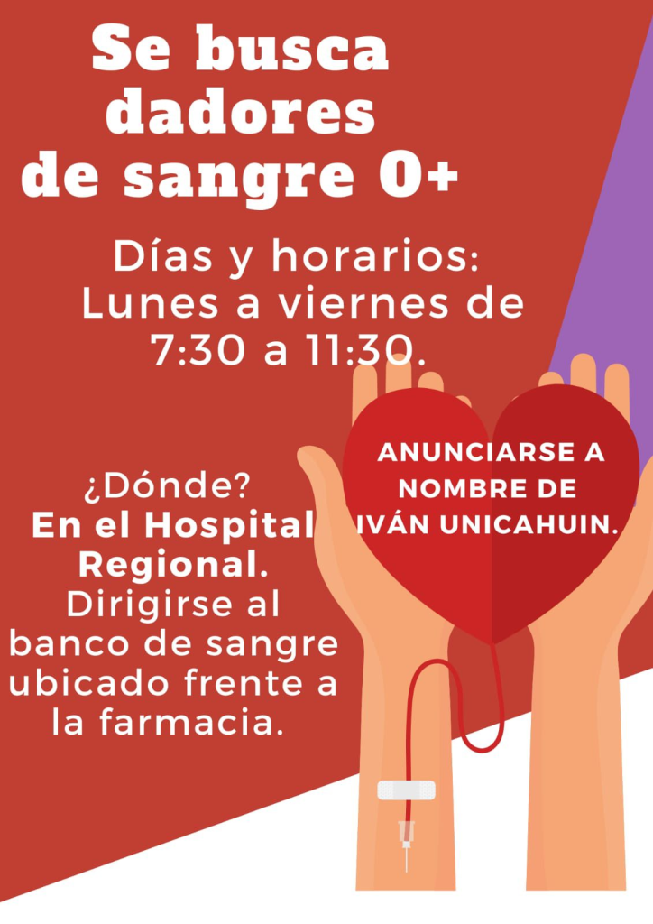 Se solicita con urgencia la colaboración de dadores de sangre grupo 0+ para un paciente identificado como Iván Unicahuín. La donación puede realizarse de lunes a viernes de 7:30 a 11:30 horas, en el Banco de Sangre del hospital, ubicado frente a la farmacia. Es importante que quienes se acerquen a donar se anuncien con el nombre del paciente.