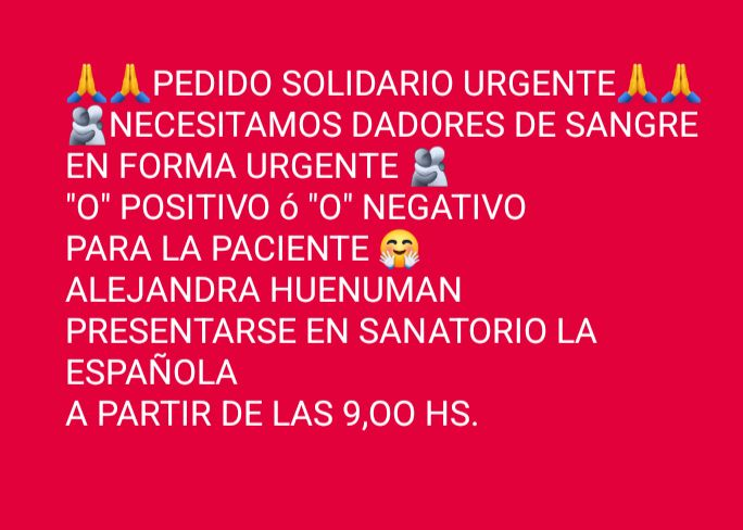 Alejandra Huenuman necesita donantes de sangre con urgencia. Se busca personas con grupo sanguíneo «O» positivo o «O» negativo para que puedan donar sangre en el Sanatorio La Española. La convocatoria es para presentarse desde las 9:00 horas en el mismo sanatorio.