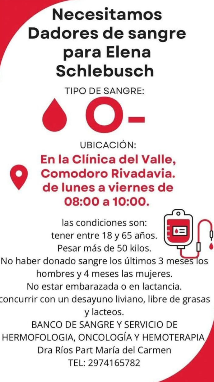 En la Clínica del Valle de Comodoro se está solicitando con urgencia donantes de sangre con tipo sanguíneo O- para ayudar a Elena Schlebusch. La donación puede realizarse de lunes a viernes, entre las 08:00 y las 10:00 horas.