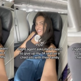 “Una azafata de vuelo me preguntó si quiero ceder mi asiento de primera clase para que un niño pudiera sentarse con su familia”, empieza explicando la joven mientras muestra su asiento que se negó a renunciar.