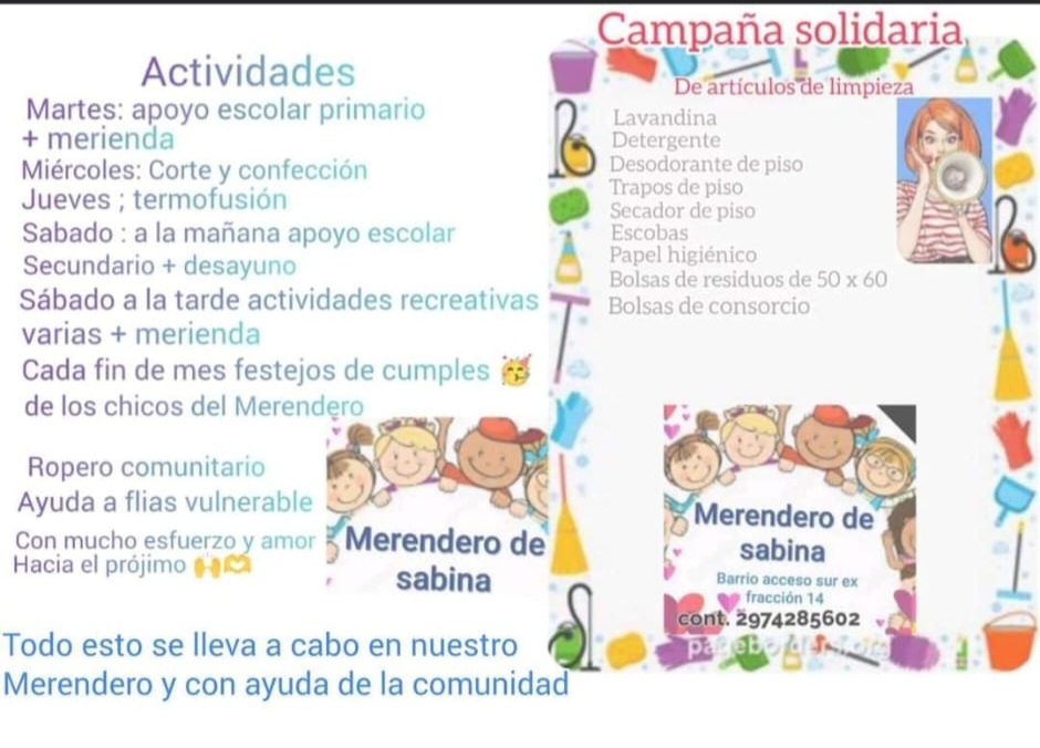El Merendero de Sabina se encuentra ubicado en el barrio acceso sur ex Fracción 14 y es un lugar donde ayudan a las familias que más lo necesitan y también se realizan múltiples actividades como apoyo escolar, corte y confección, termofusión, ropero comunitario y cada fin de mes festejan los cumpleaños de los chicos que asisten.