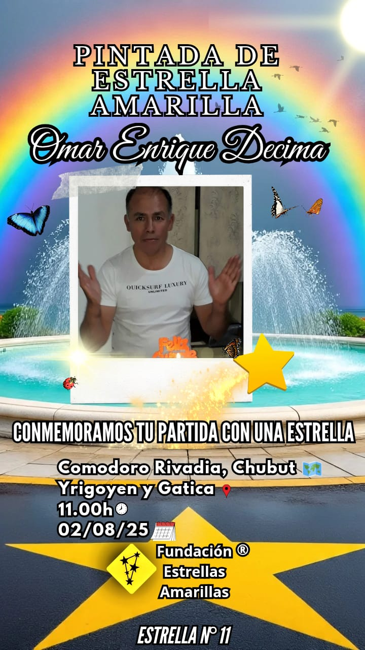 Este sábado 2 de agosto, a las 11 de la mañana, en la esquina de Yrigoyen y Gatica, se pintará la estrella amarilla número 11 en memoria de Omar Enrique Décima, vecino de 64 años y trabajador de Transportes Unión, fallecido tras un grave accidente vial.