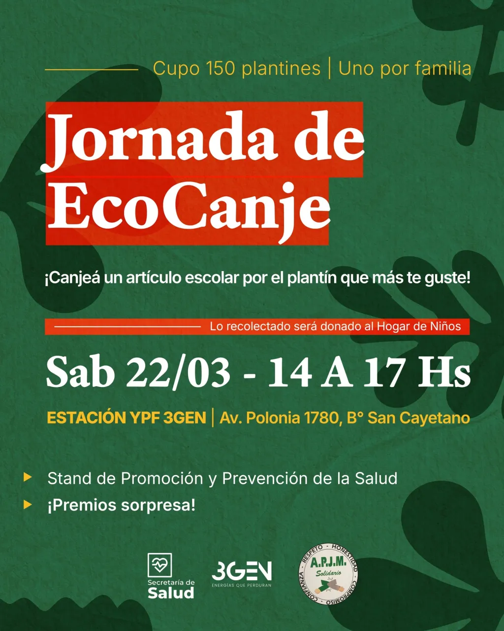 Este sábado 22 de marzo, la APJ Solidaria realizará una jornada de Eco Canje en la estación de servicio 3GEN, ubicada en Avenida Polonia 1780 del barrio San Cayetano. El evento tendrá lugar de 14 a 17 horas.