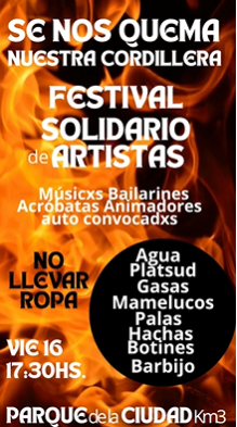 Festival solidario «Se nos quema nuestra Cordillera» invita a los vecinos a participar activamente este viernes en Comodoro Rivadavia. El evento busca donaciones para damnificados por incendios forestales mediante shows de artistas invitados.