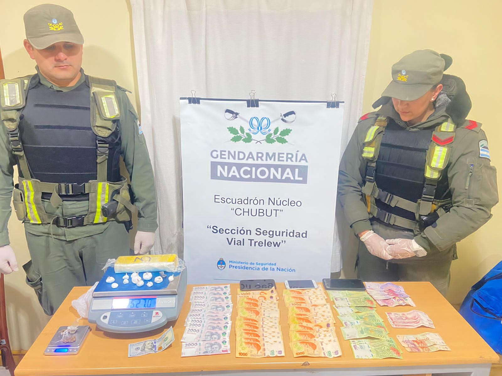 Personal de Gendarmería Nacional de la Sección Vial Chubut, dependiente de la Agrupación XIV “Chubut”, realizó un importante procedimiento contra el narcotráfico. El hecho ocurrió este miércoles 15 de mayo por la tarde cuando personal destacado procedió al contralor de un vehículo a la altura de la Ruta Nacional Nro 3 Km 1449, en el cual se constató la presencia de entre las pertenencias del conductor un paquete rectangular conteniendo una sustancia pulverulenta color blanca a la que sometida al test de orientación correspondiente arrojó resultado positivo para cocaína.