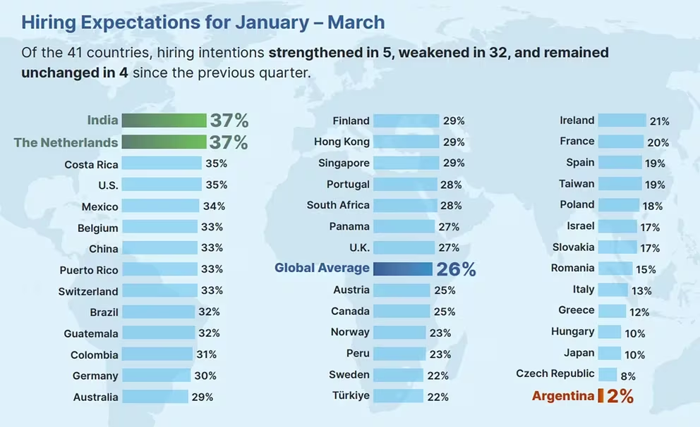 A nivel mundial, los empleadores proyectan aumentar sus nóminas en los 41 países y territorios encuestados. La de peor pronóstico, sin importar con qué región se compare, es siempre Argentina.