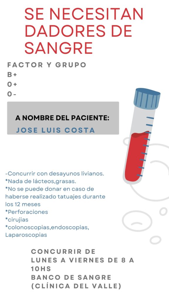 La familia de José Luis Costa solicita de manera urgente dadores de sangre de los siguientes grupos y factores: B+, 0+ y 0-.