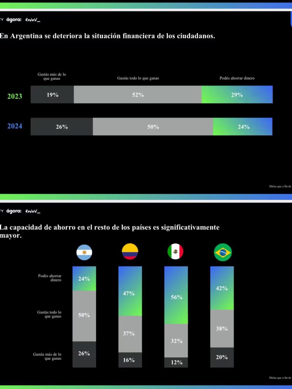 Un punto destacable para la Argentina es que comparativamente con el mismo estudio realizado en 2023, se deteriora en el país la situación financiera personal, con un aumento que pasa del 19% al 26% de aquellos encuestados que declaran que gasta más de lo que gana. Asimismo, según detectó el monitor, descendió del 29% al 24% aquellos que afirman tener capacidad de ahorro; lo que a su vez representa el valor más bajo de la región en comparación con los demás países relevados.