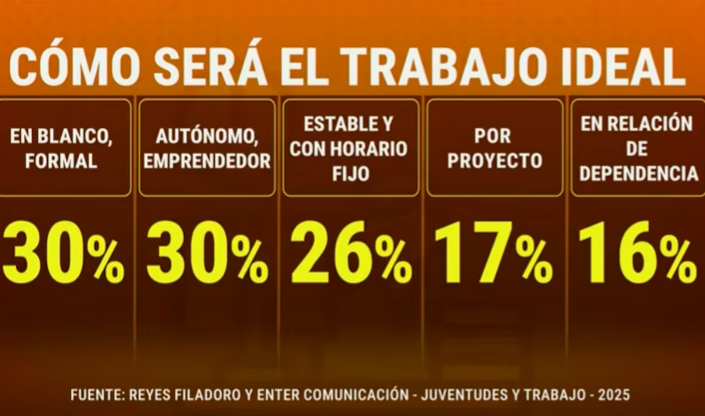 La multiplicidad de formas de empleo –de lo formal a lo autónomo– también surge en el estudio. Remarcó que el trabajo ideal para los jóvenes se divide entre el empleo formal “en blanco” y el trabajo autónomo o emprendedor, ambos elegidos por un 30% de los encuestados. “Tener un proyecto propio hoy compite a la par con el trabajo estable y formal, cuando hasta hace dos décadas la única meta era quedar efectivo y tener estabilidad”, añadió.