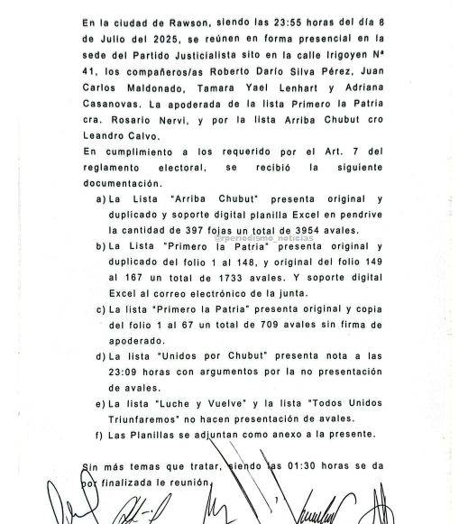 En tanto, las listas «Unidos por Chubut», «Luche y Vuelve» y «Todos Unidos Triunfaremos» no lograron cumplir con los requisitos establecidos. En el caso de «Unidos por Chubut», se presentó una nota a las 23.09 horas justificando la imposibilidad de entrega de los avales.