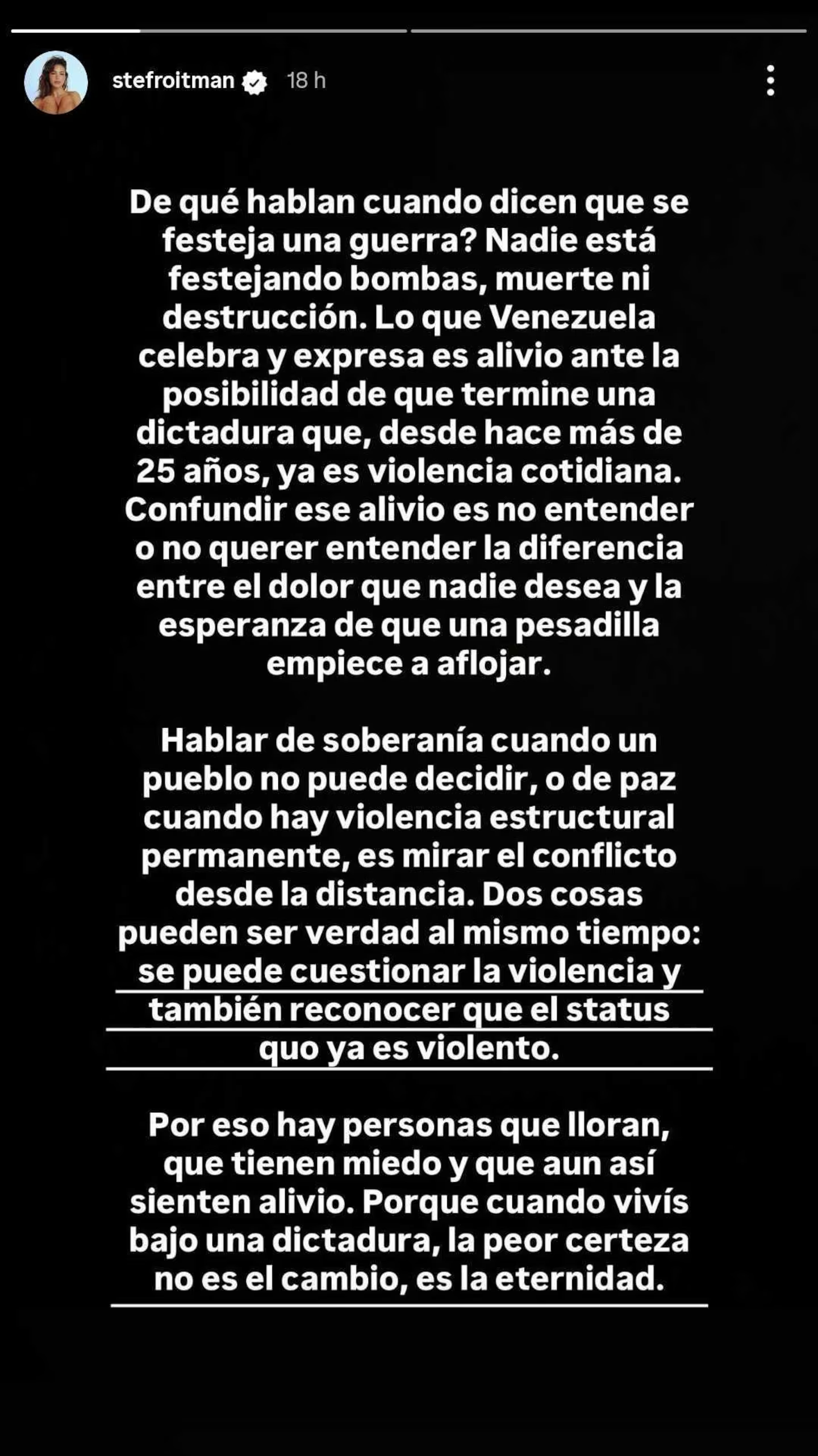 “¿De qué hablan cuando dicen que se festeja una guerra? Nadie está festejando bombas, muerte ni destrucción. Lo que Venezuela celebra y expresa es alivio ante la posibilidad de que termine una dictadura que, desde hace más de 25 años, ya es violencia cotidiana”, expresó Stefi.