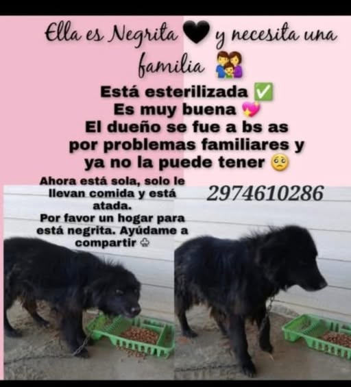 Negrita es una perrita muy buena que se encuentra en una situación difícil. Su dueño tuvo que mudarse a Buenos Aires por problemas familiares y no pudo llevársela. Desde entonces, Negrita quedó sola, atada y dependiendo únicamente de personas que se acercan a dejarle alimento.