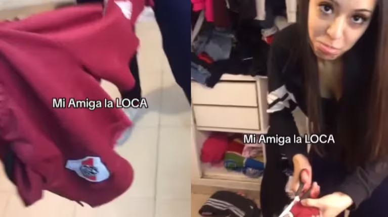 En el clip se puede ver a la joven sacando distintas prendas del ‘Millonario’ de su ropero, pero que en realidad eran de su novio, quien supuestamente le había enviado una foto junto a otra chica. Ella por celos reaccionó de una manera repudiable: agarró una tijera y comenzó a cortar una camiseta suplente del club.
