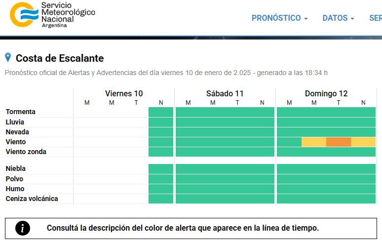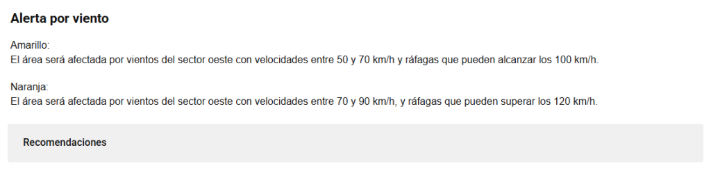 El SMN emitió una alerta naranja en razón de ello, aclarando que el promedio de la velocidad sería de 90km/h y los picos de 120km/h, aunque durante la mañana y noche también soplará con intensidad hasta alcanzar los 100km/h por momentos.
