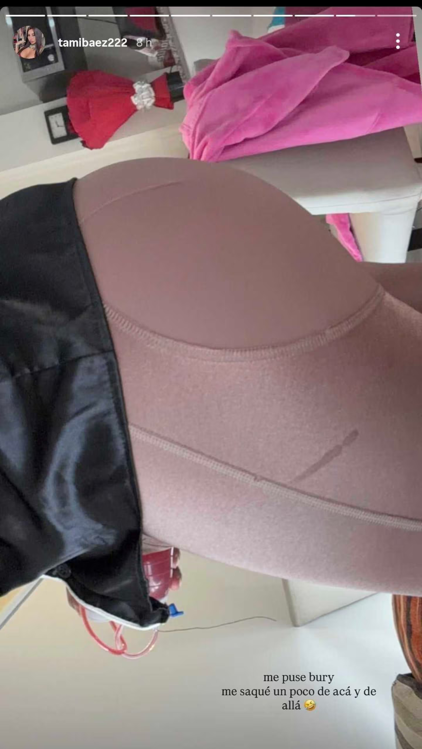 En otra de las imágenes que publicó se ve la zona de las caderas y glúteos de Báez con una faja. “Me saqué un poco de acá y de allá”, escribió la ex de L-Gante junto a un emoji de una carita riéndose.