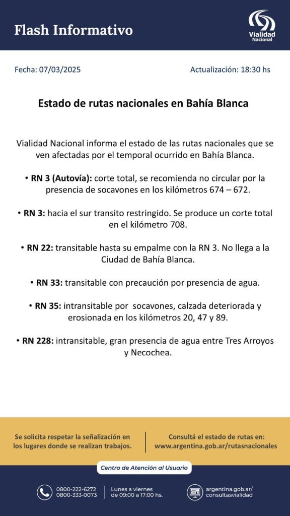 Vialidad Nacional informa que, debido al temporal en Bahía Blanca y alrededores, se recomienda no circular por las rutas nacionales que atraviesan la zona.