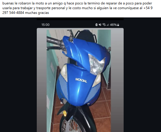 Un joven denuncia el robo de su moto Mondial 110 modelo 2024, color azul, patente A219CHJ. El hecho ocurrió en Km 3 entre el domingo a las 23 hs y el mediodía de este lunes.
