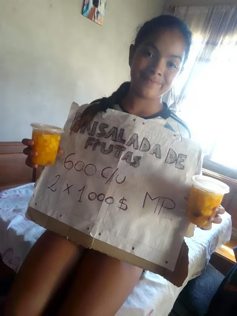 Acompañada de su mamá, recorre las calles de su barrio en El Jagüel para venderle a sus vecinos, que son sus mayores clientes. También lo hace a la salida de los colegios. Cada pote de ensalada de frutas cuesta $600, aunque también ofrece una promoción de 2 por $1000 y acepta el pago por la aplicación de Mercado Pago. “Los días que más sale a vender es cuando hace calor porque es cuando más demanda hay”, precisó Ayelén.