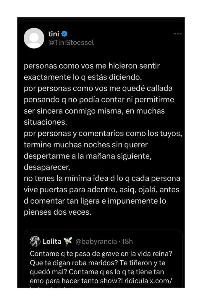 Stoessel tomó nota de este posteo, lo citó en su perfil y escribió: “Personas como vos me hicieron sentir exactamente lo que estás diciendo. Por personas como vos me quedé callada, pensando que no podía contar ni permitirme ser sincera conmigo misma, en muchas situaciones. Por personas y comentarios como los tuyos, terminé muchas noches sin querer despertarme a la mañana siguiente, desaparecer”, expresó la artista. Y cerró: “No tenés la mínima idea de lo que cada persona vive puertas para adentro. Ojalá, antes de comentar tan ligera e impunemente, lo pienses dos veces”.