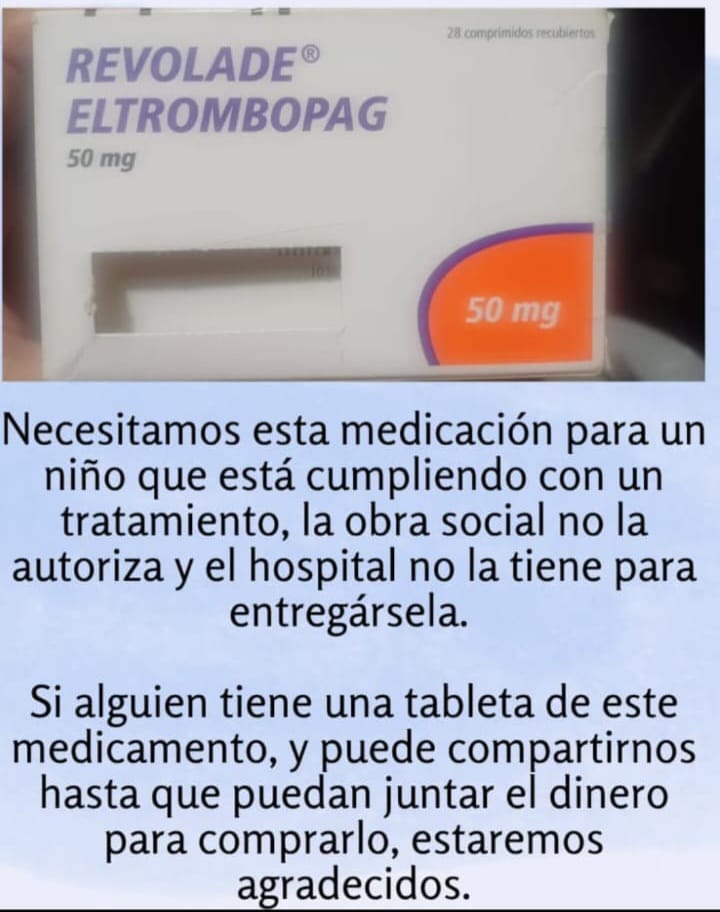 Una madre pide ayuda para conseguir el medicamento que necesita su hijo Stefano, quien está en tratamiento por púrpura trombocitopénica idiopática. La obra social no cubre el costo y el hospital no puede proveerlo. Stefano tiene medicación solo hasta el martes y es urgente conseguir más.
