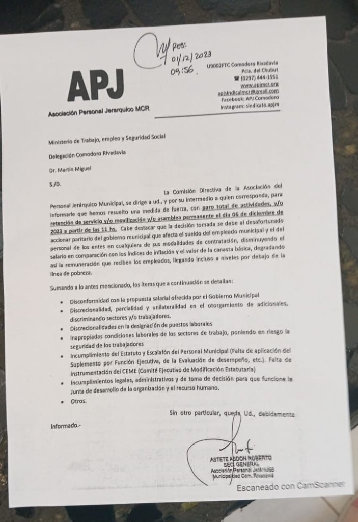 La decisión, tomada de manera unánime, consiste en un paro total de actividades, retención de servicio, movilización y asamblea permanente el día 06 de diciembre de 2023, a partir de las 11 horas.